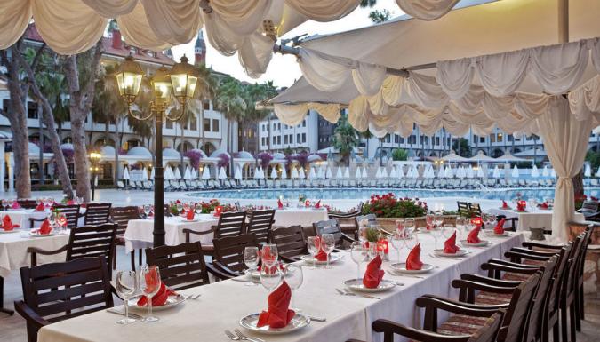 Бар (турецкая кофейня, многочисленные бары: Lalezar Bar – бар на открытом воздухе у бассейна. В ассортименте – импортные напитки и коктейли. Kubbe Bar – диско-бар рядом с открытым бассейном. Tennis Bar – два бара возле теннисных кортов, предлагающих прохладительные напитки. Beach Bar – бар на пляже с прохладительными и алкогольными напитками. Serbet Bar – бар рядом с бассейном, в ассортименте – прохладительные напитки. Sofa Cafe – кафетерий. Saray Muhallebicisi – кондитерская с восточными сладостями. Seyir Bar – находится в “Башне правосудия”, прохладительные и алкогольные напитки. Begum Bar – круглосуточный бар, в котором подаются прохладительные и алкогольные напитки. Divan Bar – прохладительные и алкогольные напитки.), Библиотека/читальный зал, Врач, Игровая комната, Лифт, Магазины (кондитерская, торговая галерея), Прачечная, Прокат автомобилей, Ресторан (Основной ресторан, турецкий, итальянский и рыбный рестораны), Сейф (Особые условия), Телевизионная комната, Холл, Химчистка