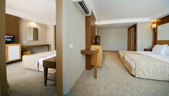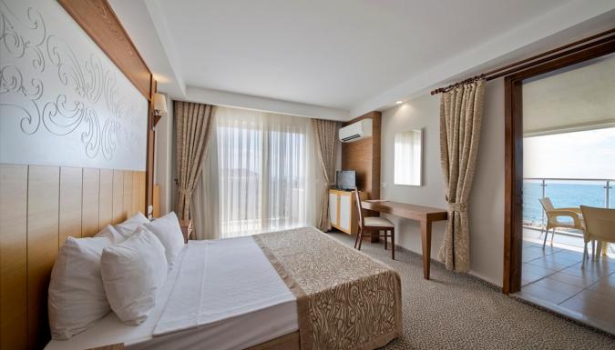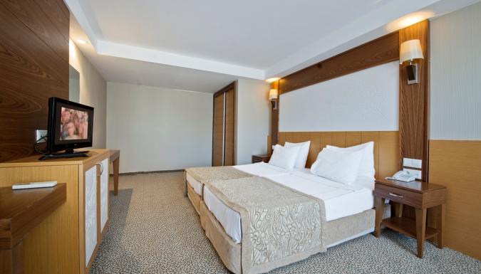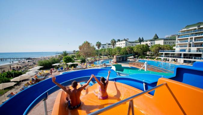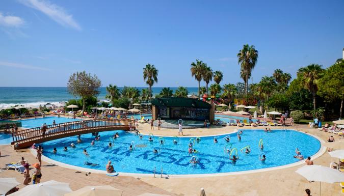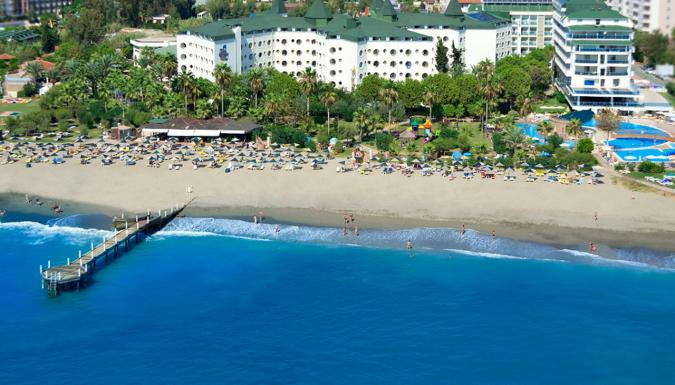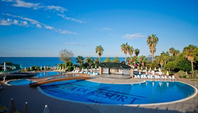 Наш отель, работающий по системе Ультра Все Включено, имеет собственный уникальный пляж длиной 200 м, а также потрясающие своей красотой зеленые сады. Наш основной ресторан располагает как закрытым залом, так и террасой, открытой в летние месяцы. Наш дружелюбный и профессиональный персонал рад принимать Ваши заказы целый день в барах и ресторанах, которые открываются в определенное время согласно расписанию работы: Лобби-бар, Снек-бар, Бар у бассейна и Чайный дом. Для незабываемых и наполненных весельем вечеров Вас ждут Амфитеатр и дискотека. 3 больших открытых бассейна, 1 крытый бассейн, 2 детских бассейна, водные горки, детская площадка, мини-клуб, турецкая баня, сауна, фитнес-центр, салон красоты, игровая комната, интернет-кафе, бильярд, настольный теннис, 1 большой и 2 небольших конференц-зала, амфитеатр, школа подводного плавания, дискотека, теннисный корт, пляжный волейбол, пляжный футбол и футбольное поле – все это ждет Вас в отеле MC Beach Park Resort, расположенном прямо на берегу моря