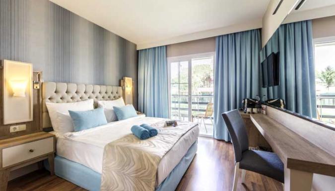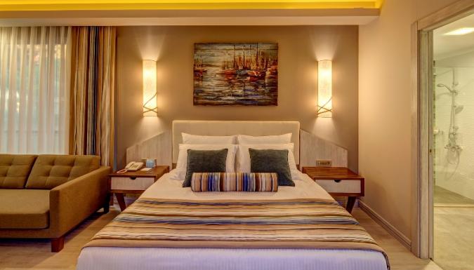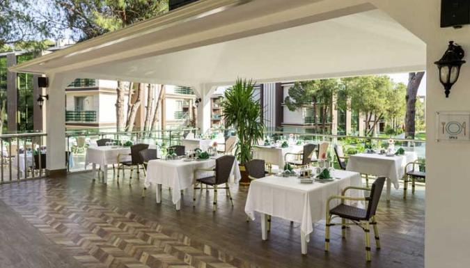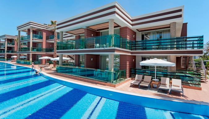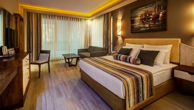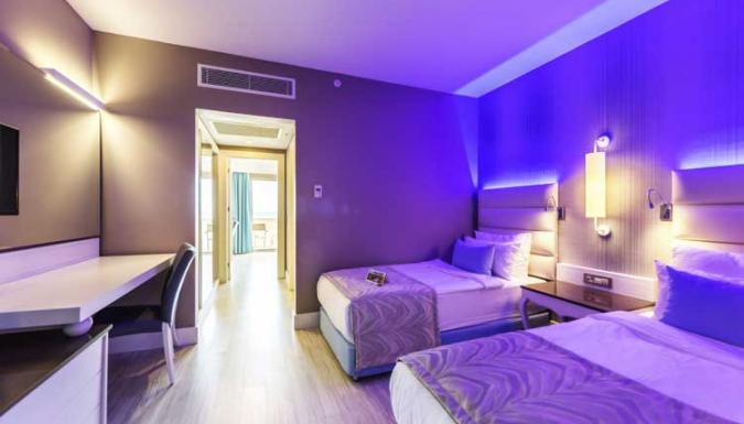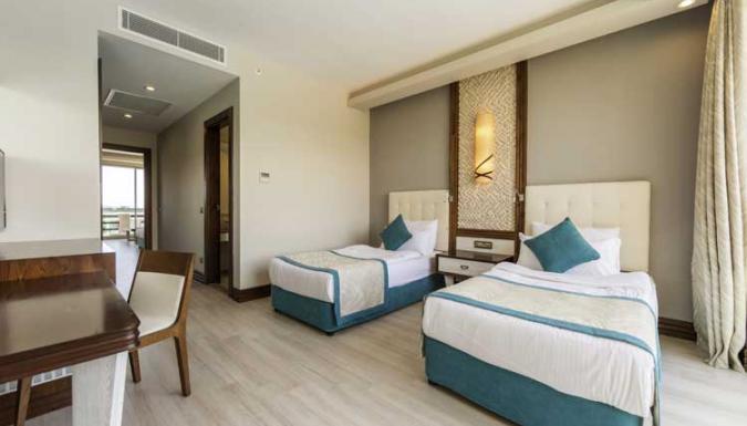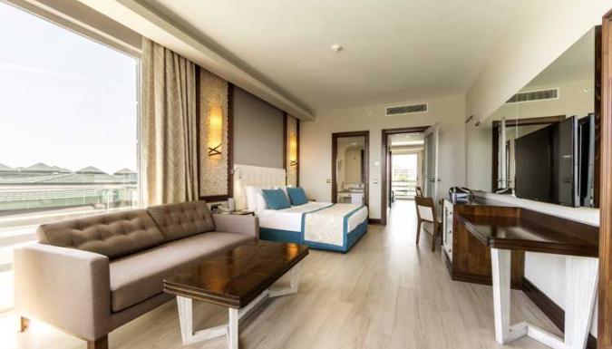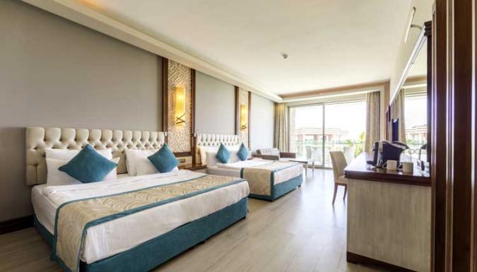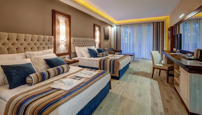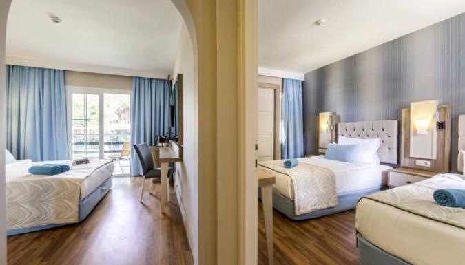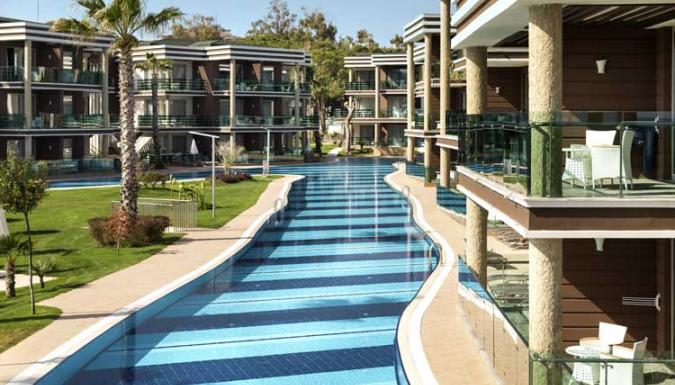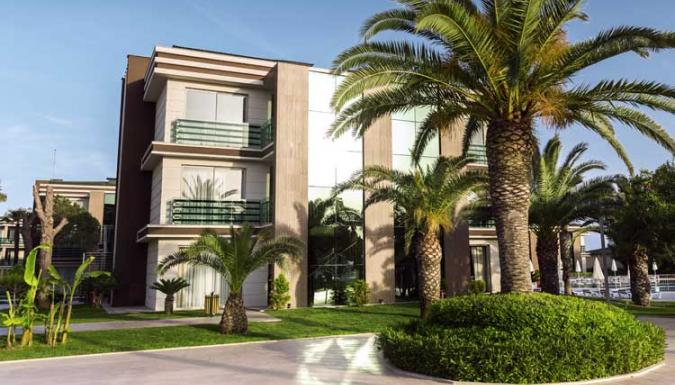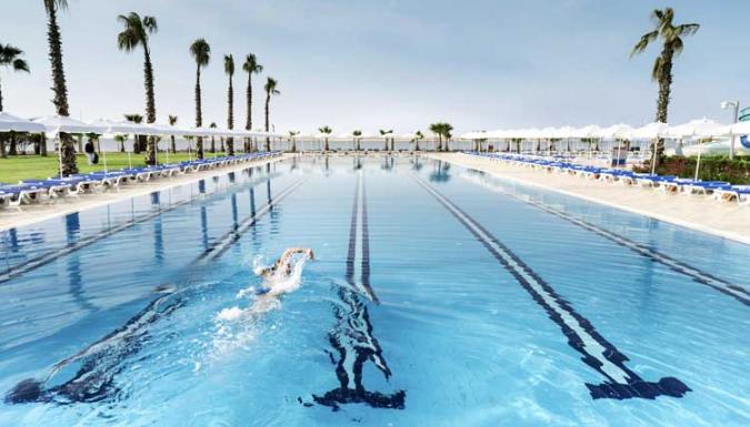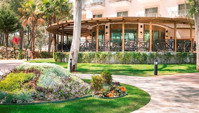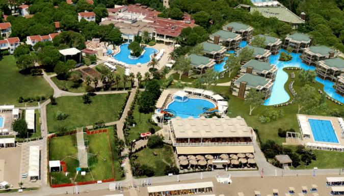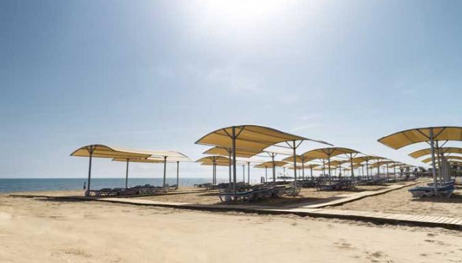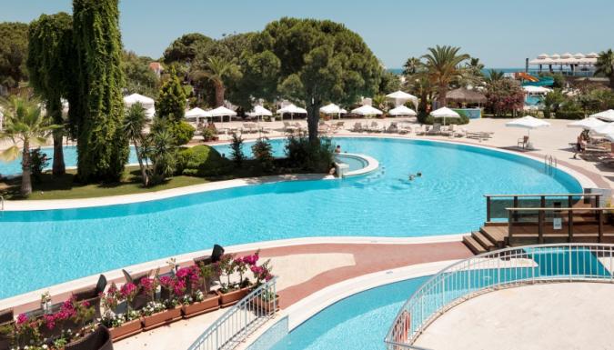 Большой отель на самом берегу Средиземного моря. Комфортабельные и просторные номера, рестораны, бары, открытые и крытый бассейны, водные горки, прекрасный песчаный пляж, анимационные программы.