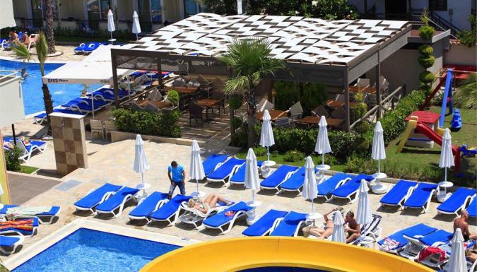 Отель расположен в 2 км от центра г. Сиде. Аэропорт Анталии находится в 65 км от отеля. Отель был открыт в 2000 году, последняя реновация проводилась в 2014 году. Общая площадь территории составляет 6 070 кв.м. Состоит из 3-этажных зданий. Отель размещает гостей с ограниченными физическими возможностями. Общественный песчаный пляж находится в 2 км от отеля. Курсирует шаттл на пляж, бесплатно. Шезлонги, зонтики, матрацы - бесплатно, полотенца - платно. Заход в море - песок. Кабинки для переодевания.