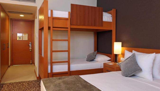 Кроватка, по запросу, детская анимация, мини-клуб (4-11 лет), спальная комната, детский бассейн 42 кв.м, крытый бассейн 14 кв.м, игровая комната, детские стулья в главном ресторане, коляска (платно, по резервации).