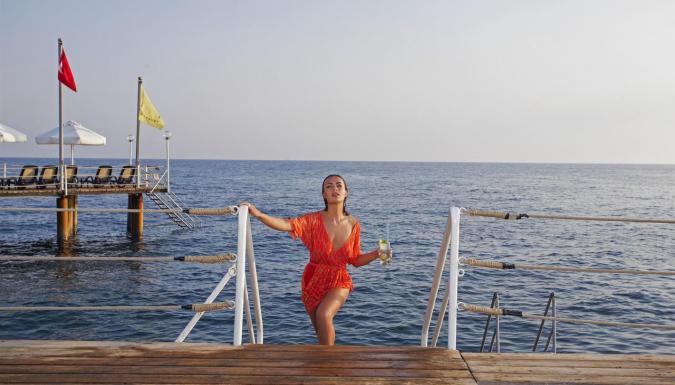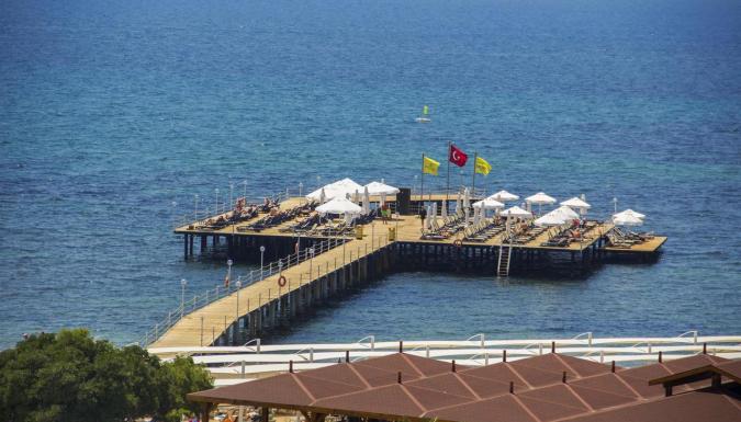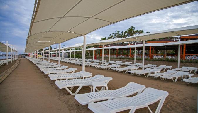 Собственный песчано-галечный пляж находится рядом с отелем. Протяженность пляжа составляет 250 м. Шезлонги, зонтики, матрацы, пляжные полотенца - бесплатно. Заход в море - песок, камни, пирс. Бар на пляже, душ, кабина для переодевания, спасатель.