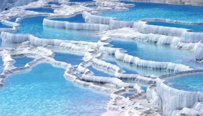 Дальше мы отправляемся в Памуккале к «хлопковому замку». По пути предоставится возможность продегустировать вино местного разлива. Видимые издалека всемирно известные белоснежные террасы (травертиновые образования) возникли в результате отложения солей из насыщенных кальцием источников термальных вод. (экскурсия за дополнительную плату).
