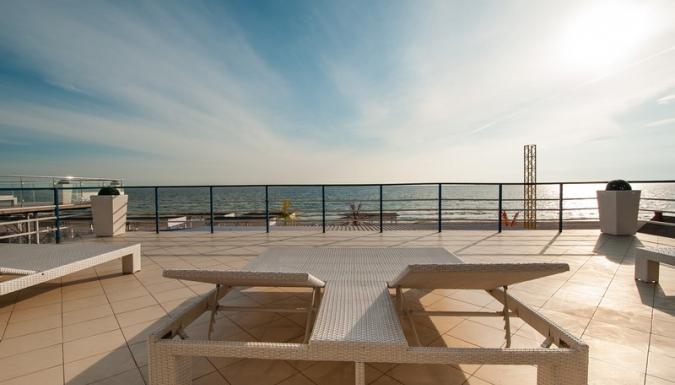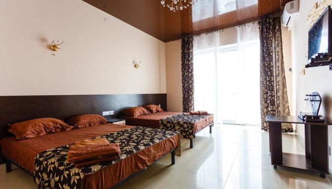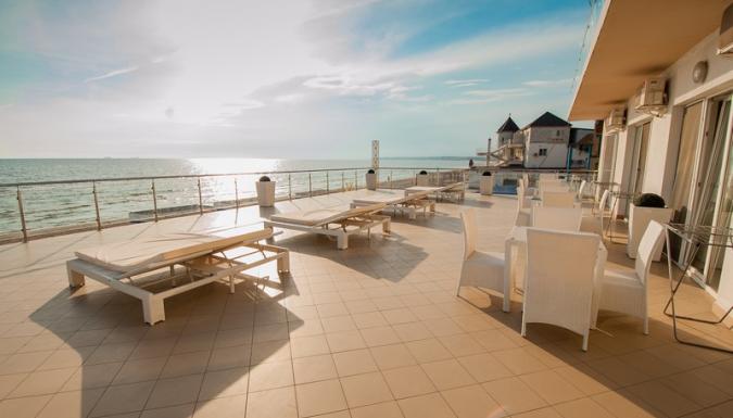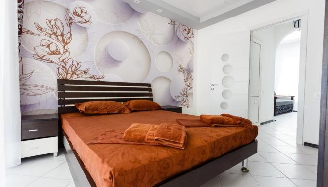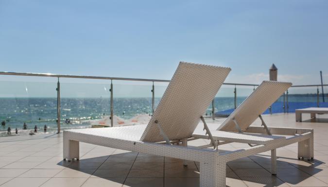 Спальня выходит на просторную (100 м2) балкон-террасу с видом на море. Здесь Вы сможете уютно и с комфортом провести теплые летние вечера, любуясь морским пейзажем и заходом солнца. Отель на берегу в Коблево предоставляет современный дизайн и интерьер, которые создадут приятное ощущение уюта для ценителей комфортного отдыха. В номере «Апартаменты» одновременно могут разместиться до 5 человек.