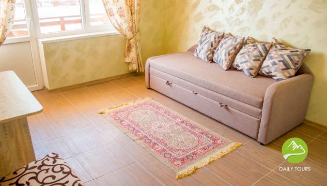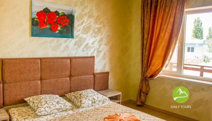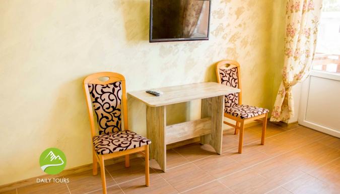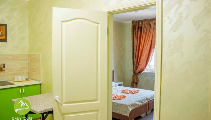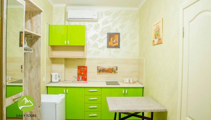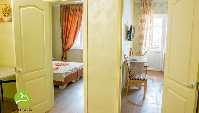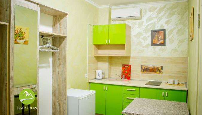 LCD телевизор, кондиционер, холодильник, стильная мебель, двуспальная кровать с ортопедическими матрасами, прикроватные тумбочки, др необходимая мебель, санузел (туалет, душ, умывальник), балкон с набором пластмассовой мебели