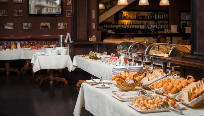 По утрам в отеле «Одесский дворик» сервируют разнообразный завтрак «шведский стол».