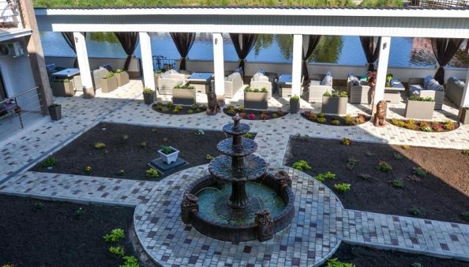Двор просторный и ухоженный, на территории есть столики, стулья и диваны для отдыха на свежем воздухе под приятное журчание фонтана во дворе.