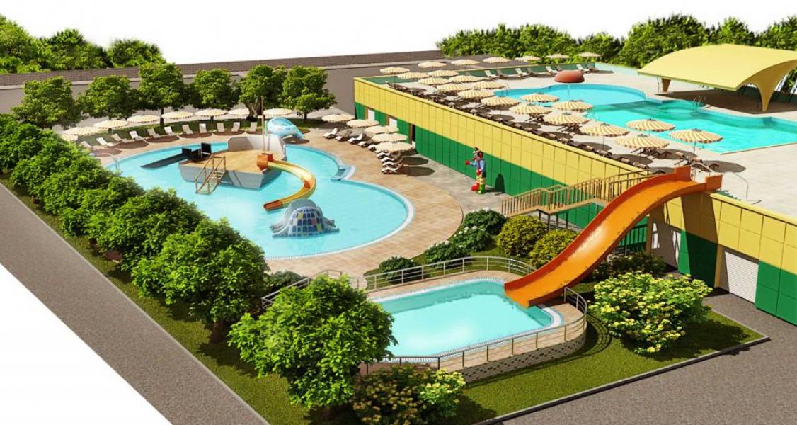 Большой бассейн. В бассейне имеются три уровня дна (0,80м, 1,20м, 1,65м) и для самых маленьких «Пиратский корабль», окружённый горками для развлечений.