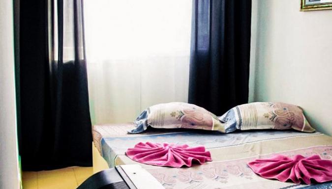 - однокомнатый стандарт (1 -3 человека): номер до 22 кв.м. с удобствами, односпальными и двуспальными кроватями, правом пользования без доплаты всеми бассейнами и шезлонгами. Кондиционер, санузел (туалет/душ), холодильник, холодная/горячая вода;
