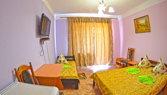 Номера с удобствами (2-х и 3-х местные): каменный корпус новой постройки, LCD телевизор, кондиционер, холодильник, стильная мебель, двуспальная кровать с ортопедическими матрасами, прикроватные тумбочки, дрнеобходимая мебель, санузел (туалет, душ, умывальник), балкон с набором пластмассовой мебели, горячая/холодная вода подается круглосуточно.