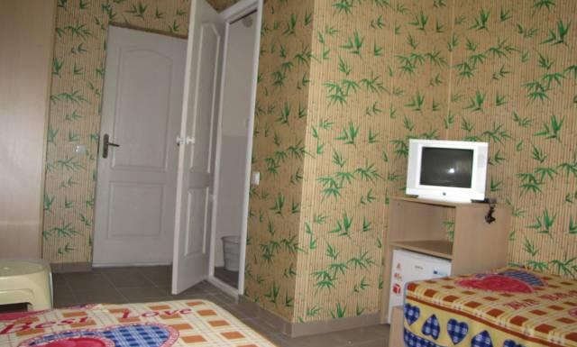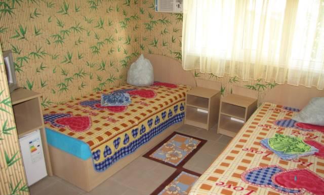 Двухместные, трехместные однокомнатные номера "эконом": (2-х местные – две кровати односпальные, 3-х местные – кровать односпальная и двуспальная раскладная тахта): 2 и 3 этажи, тумбочки, шкаф, стол, стулья, балкон, холодильник, вентилятор, умывальник, окна - стеклопакет; душ холодный круглосуточно, горячий с 17:00-20:00; туалет на этаже.