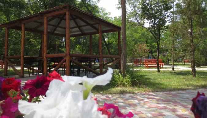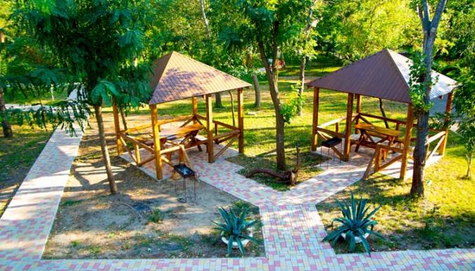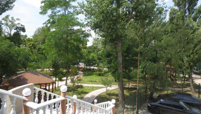 Территория отельного комплекса "Green Land" - это большая парковая зона с беседками, скамейками, лужайками и клумбами.