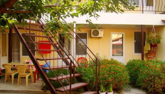 Поблизости имеется небольшой продуктовый магазин, всего лишь сто пятьдесят метров до набережной, рынок в шаговой доступности, имеется оборудованная кухня( холодильники, газовые плиты, необходимая столовая посуда, чайники), уютное кафе с домашней кухней и 3-х разовым комплекснам питанием, можно взять мангал напрокат, летняя площадка с телевизорами, пансионат оборудован видеонаблюдением, имеются семейные номера