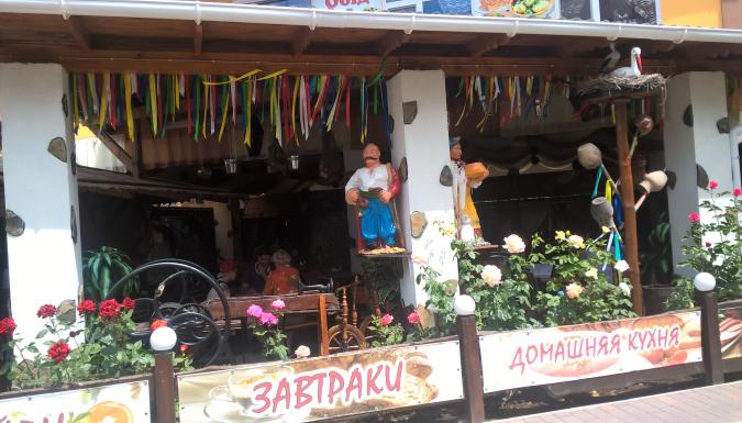 Напротив пансионата "Отрада" расположено кафе украинской кухни, где можно заказать комплексные обеды (прим. 55 гр. лето 2017), круглосуточный продуктовый магазин. Рынок, автовокзал и конечная остановка маршруток в 300м. от пансионата