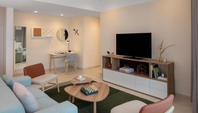 К услугам гостей номера-студио и люксы с одной, двумя или тремя спальнями, в которых современный дизайн сочетается с просторной планировкой. Многие из наших люксов имеют великолепный вид на город или море. Во всех номерах и люксах обустроена полностью оборудованная кухня. Гости, путешествующие семьей или небольшой компанией, могут забронировать смежные люксы.