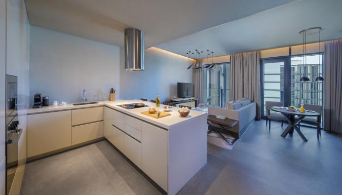 - полностью оборудованная кухня (холодильник, микроволновая печь, электрическая плита, столовые приборы, посуда, раковина, стиральная машина