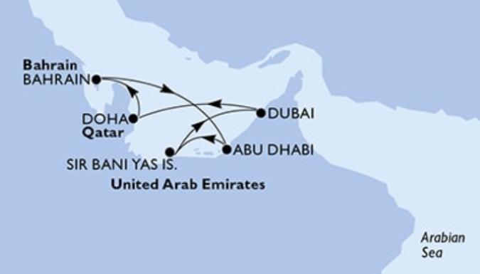 - Круиз на морском лайнере с посещением городов Дубай, Доха, Бахрейн, АбуДаби и остров Сир-Бани-Яс.