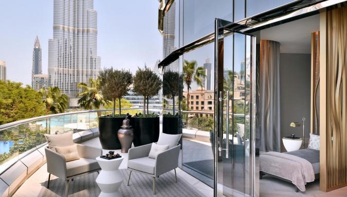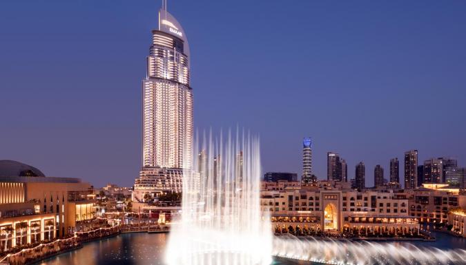 Отель Address Downtown класса люкс расположен в самом центре Дубая, в 64-этажном небоскребе высотой 302 метра. Из отеля открывается прямой вид на крупнейший в мире торгово-развлекательный центр Dubai Mall, в который можно пройти по навесному мосту.