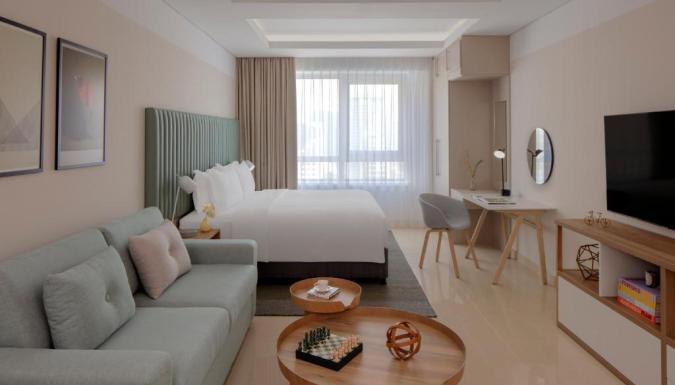 Расположенные на 15 этажах номера-студии и люксы с 1 и 2 спальнями отличаются современным дизайном интерьера, а также просторными планировочными решениями с обилием света. Во многих люксах есть собственный балкон, с которого открывается захватывающий панорамный вид на город или море. В каждом номере в распоряжении гостей собственная полностью оборудованная кухня, а смежные люксы отлично подходят для семей или небольших групп, путешествующих вместе.