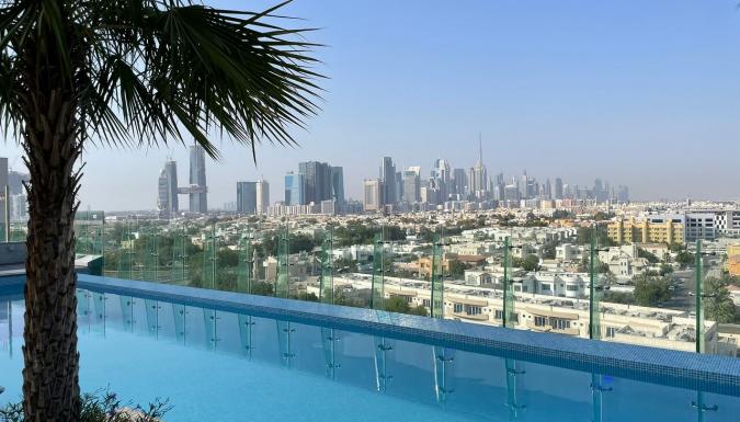 Инфинити-бассейн на крыше с видом на Шейх Заед роуд и Бурдж Халифа.