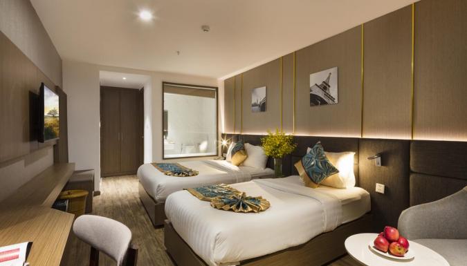Deluxe room (24-28 кв.м., макс. 2 взрослых + ребёнок) - спальня (dbl bed/twin beds), ванная комната, балкон с видом на город/частичный вид на море