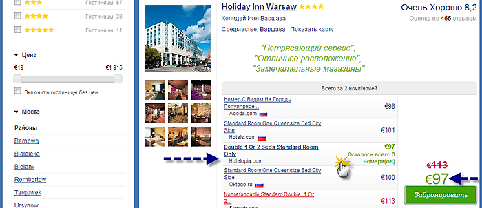 Многие отели для клиентов электронных системы предусматривают специальные цены. Действительно, на сайте самого отеля можно не найти низкой цены и этому не стоит удивляться. Гостиницы заинтересованы в оказании высокого сервиса, а продажу предпочитают отдавать крупным игрокам в интернете. В результатах поиска гостиниц на Holiday.by можно увидеть не только лучшую цену, но и сайт, на котором предстоит осуществить заказ номера. Вот лишь несколько советов, как найти лучшую цену на отель в интернете Получив результаты поиска, не спешите удалять из выборки дорогие или дешевые отели. Часто гостиницы снижают цены либо за раннее бронирование, либо на предложение сегодня-на-завтра. Иногда можно остановиться в 3-х или 4-звездочной гостинице по цене бюджетного хостела. Скидки на отели отмечены в системе и вы их сразу заметите. Экономия в 5 долларов за ночь, это целые 50 у.е. за десять дней. Внимательно сравните цены на номера в отеле в различных системах. На Holiday.by это видно сразу с ценами и названиями сайтов. При этом обратите внимание, за счет чего те или иные системы делают скидку.