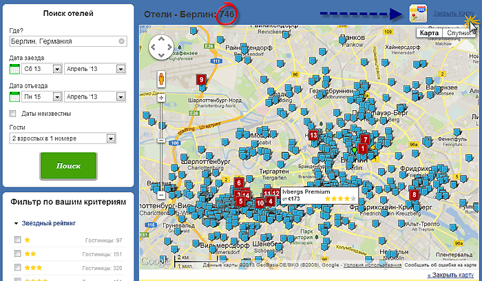 Поиск отеля для самостоятельного бронирования при помощи карты города. Достаточно переводить курсор от флажка к флажку, чтобы видеть цены гостиницы на нужные вам даты. Возможно, за углом есть номер дешевле.