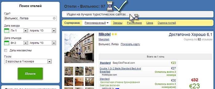 Поиск гостиниц осуществляется по лучшим базам всего мира для гарантии оптимальной цены. В одной системе объединены поиск по отелям, недорогим хостелам и частным апартаментам, что дает возможность широкого выбора. Поэтому сам поиск может занять немного времени. Дождитесь его окончания – это того стоит. Продолжение инструкции. Читайте далее:
